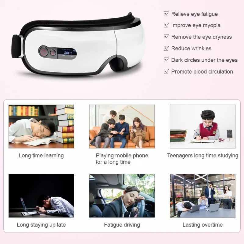 Engineered with air bags and a programmed chip inside, intelligent air pressure is generated to imitate shiatsu kneading to the ocular acupressure points accurately with a soothing rhythm, greatly relieving the muscle strain and fatigue.