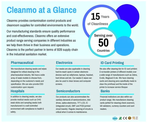 Технология Cleanmo производит экономически эффективные чистящие средства, такие как тампоны для чистых помещений, Чистящие Карты и чистящие салфетки. Мы обслуживаем различные отрасли по всему миру. Мы сертифицированы ISO с мировым качеством.