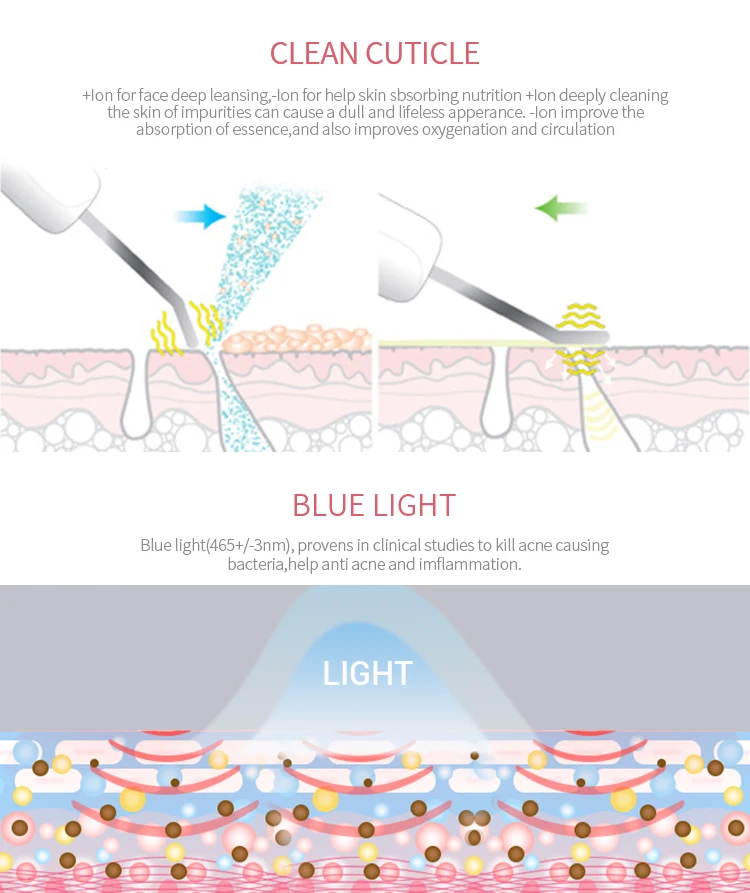 Feature: 1. Ultrasound & ion for cleansing. 4. Blue light therapy: 465±3nm 10. Size: 175MM*20MM*52MM | Outstanding Points: 1. wireless charging 2. waterproof, can use at bath 3. mini, portable for home use 4. intellegent, auto power off. 5. Easy use, one button control |