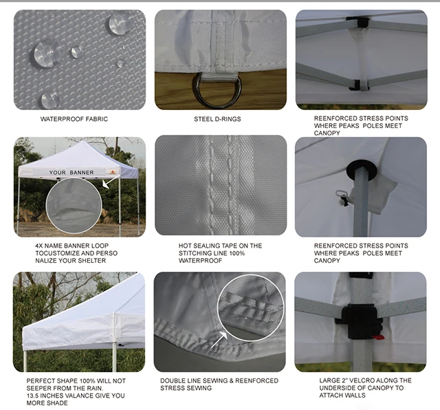 Наша компания специализируется на всплывающем навесе. Стальная рама промышленного класса использует 100% новых нейлоново-композитных фитингов, легко устанавливается без привязки, в то время как «замок большого пальца» делает навес еще проще для установки и снятия. Профессиональный навес подходит для 10 футов на 10 футов.