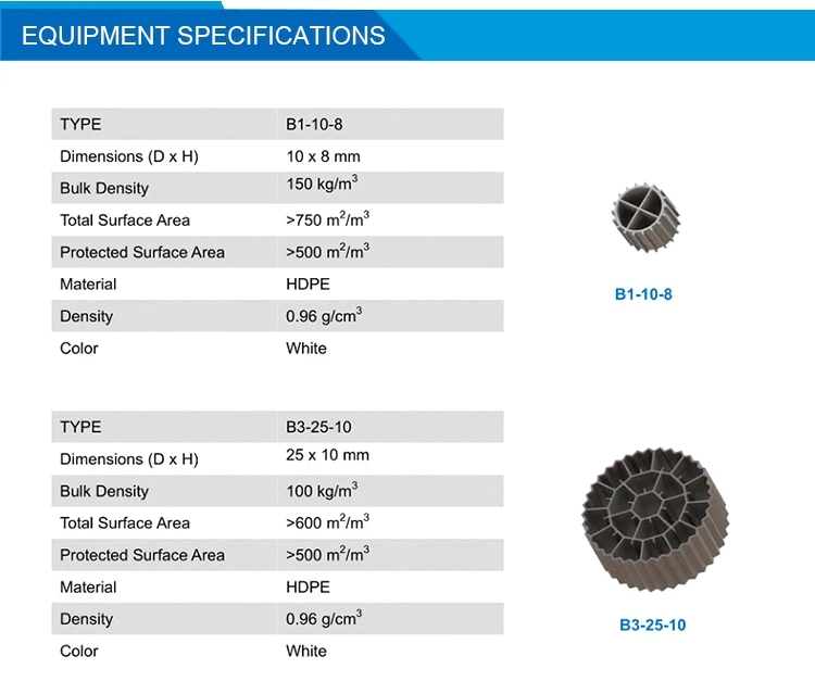 YOSUN media used in MBBR are continuously in motion caused by air injection and agitator. The specific density of the media can be adjusted from 0.95 to 1.05g/cm3, depending on customers’ demand.However it has to be considered that the actual density of the carrying media will Increase as the biofilm develops on the media surface.