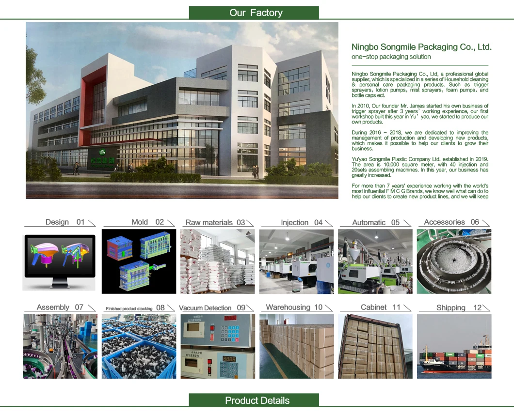 In Apr. 1st 2014,Ningbo Songmile Packaging Co.,LTD founded.Our products have expanded to other plastic packaging,including several types of trigger sprayer, lotion pump and fine mist sprayer. New equipments and production lines are installed in the same year, and we are fast moving to catch up with growing demand.