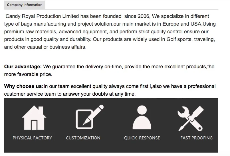 Our main products are golf bag, fishing bag, travel bag, backpack, and handbags.