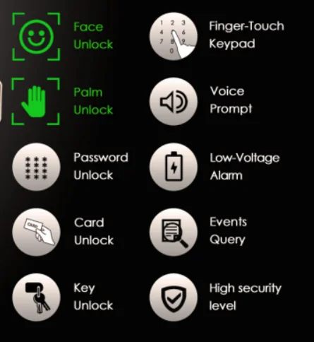 5. Unlock mode: Face, Palm, password, Mechanical key, RFID card;