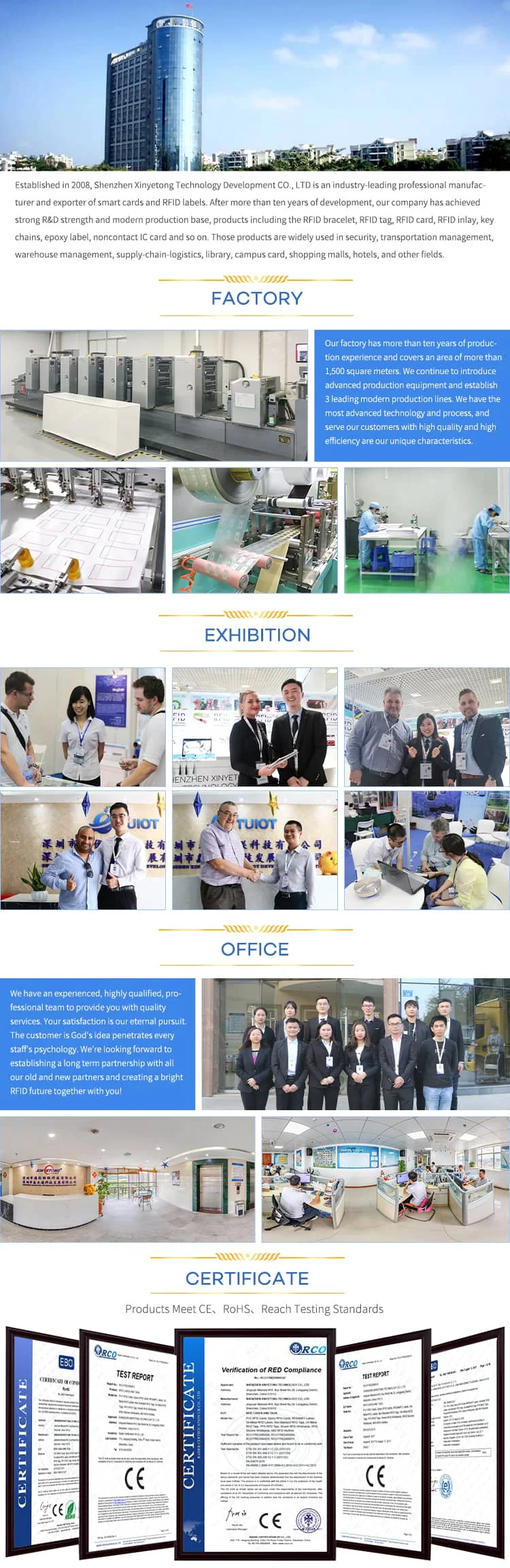 A | We have LF, HF and UHF chips with various memory and reading distance. If you are not sure, please inform our sales with project details. Here are some commonly used chips and inlays for your reference: 1. LF (0-5cm): TK4100 (64 Bit), HitagS256 (256 Bit), EM4305 (512 Bit). 2. HF (0-15cm): 213 (144 Byte), F08 (1K Byte), I CODE SLIX (128 Byte). 3. UHF (1-10m): AlienH3 (96 Bit), Alien H4 (96 Bit), Monza 4D ( 128 Bit). 4. Inlay: AlienH3 9654, AlienH4 9762, Impinj M4QT, Impinj M4E. Chips are then mounted on different inlays (Antenna etched on PET layer) for achieving different reading distance and angles. Our sales will provide you the most suited inlay if not specified. |