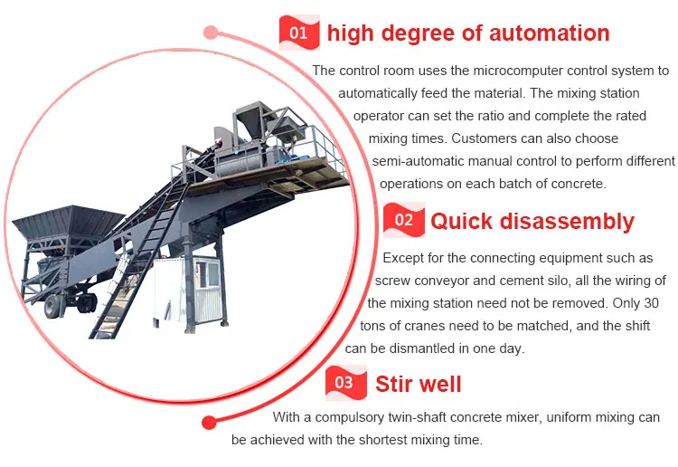Мобильная интегрированная бетонный завод состоит из смесителя JS, PLD машина для производства, цементный завод, ленточный конвейер машина с микрокомпьютерным контроллером и комнаты, управление системы и системы подачи порошка. Сотрудничества добиваться высокой производительности. Управление микрокомпьютером Номер расположен в конце шасси и устанавливается под смеситель для кухни. Весь процесс кормления и смешивания материал может быть легко наблюдать.