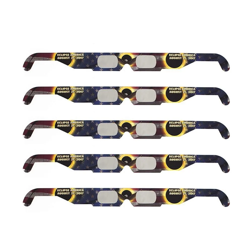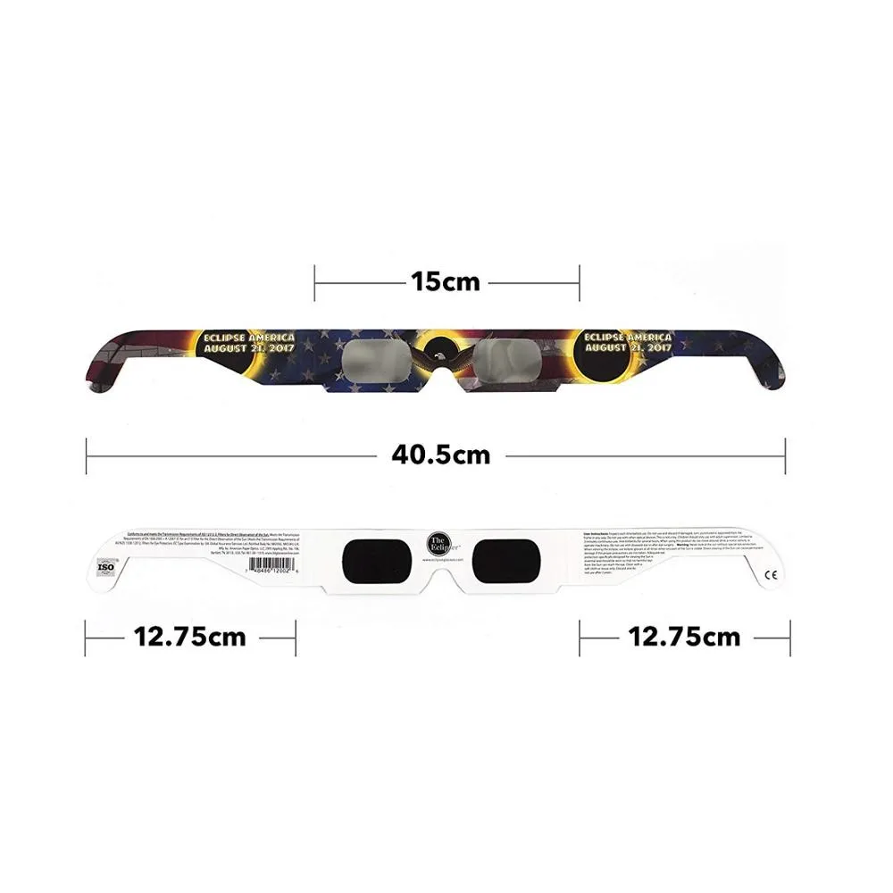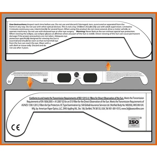 Абсолютно безопасно для прямого солнечного просмотра солнечных затмений, солнечных пятен и других солнечных явлений. Все наши материалы для солнечного обзора имеют оптическую плотность 5 или больше и сертифицированы CE, что отвечает требованиям передачи весов 12-16 EN 169/1992. Линзы изготовлены из нашей эксклюзивной устойчивой к царапинам оптической плотности 5, черный полимерный "материал. Затменные оттенки фильтруют 100% Вредных Ультрафиолетовых, 100% вредных инфракрасных и 99.999% интенсивного видимого света. Эти фильтры премиум-класса создают более яркое оранжевое изображение солнца. Задняя сторона напечатана с инструкциями и информацией о безопасности.