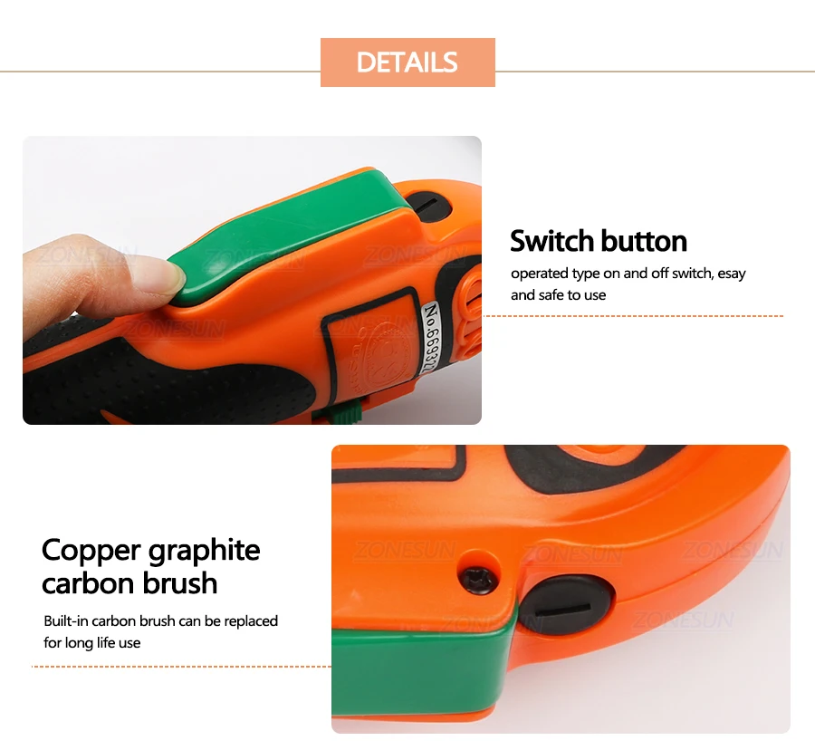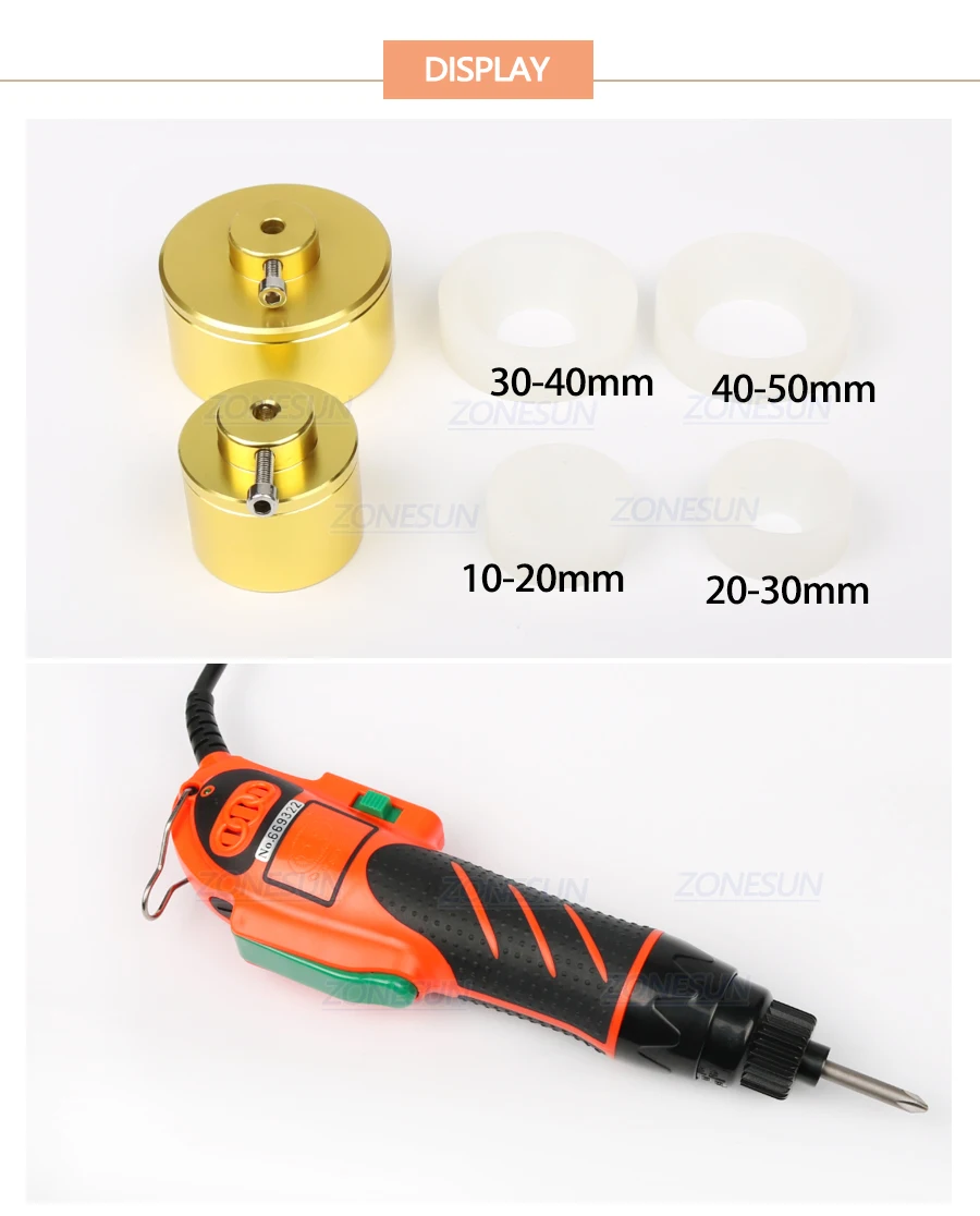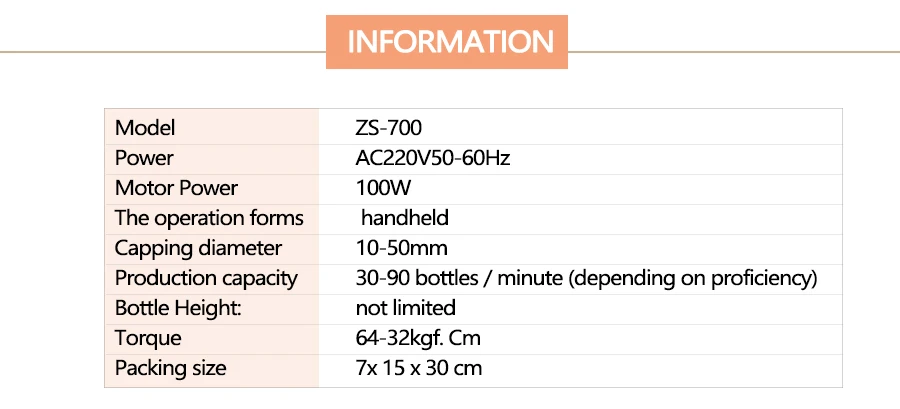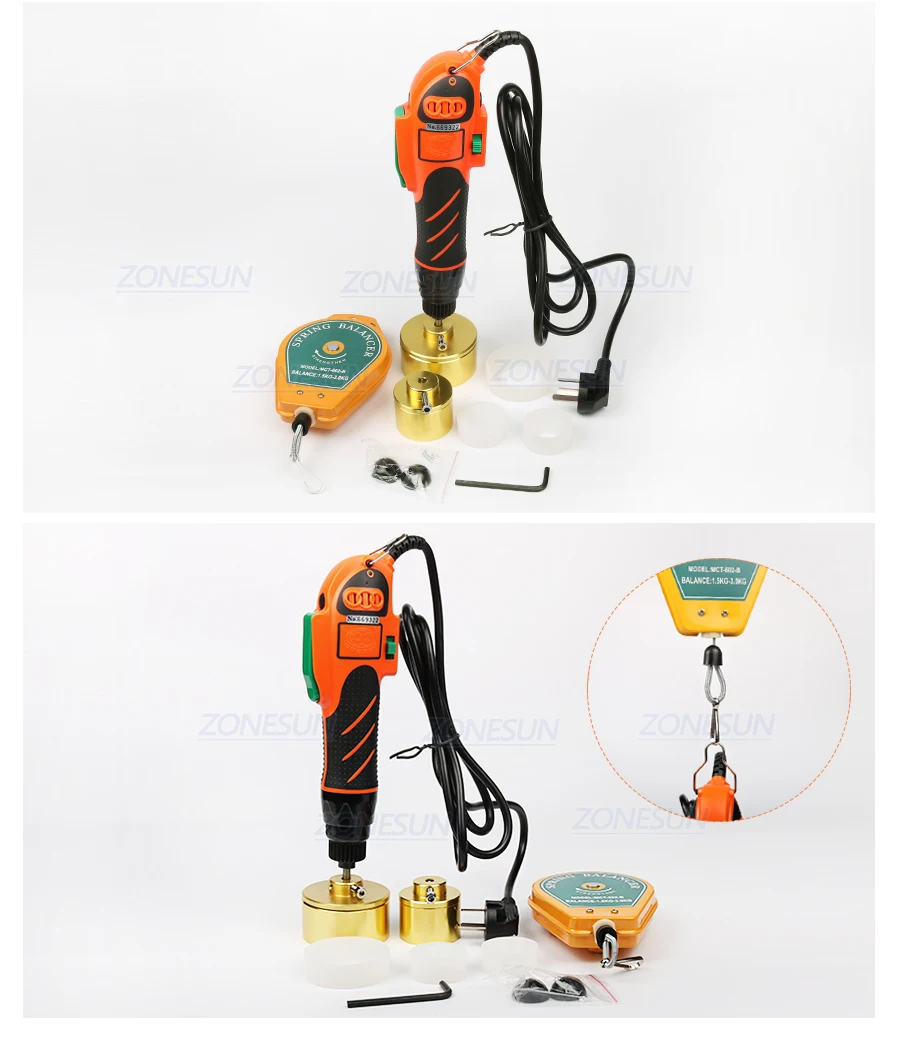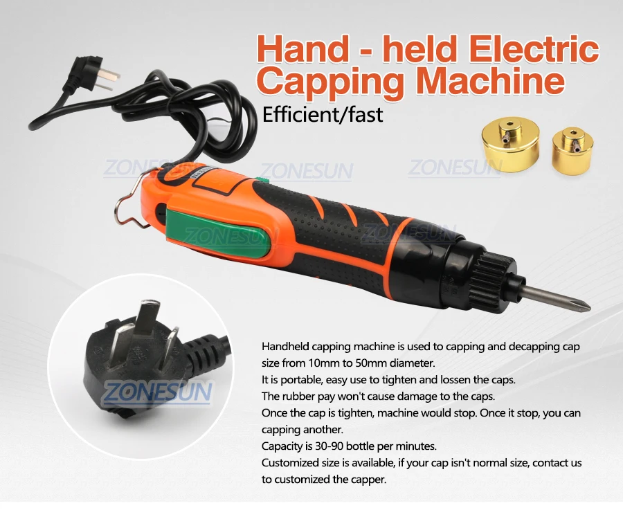 Hand-held electric capping machine is mainly used to the screwcap tighten and loosen. Easy to carry, which can be easily used to tighten or loosen the cap. Of its adjustable clutch (readjustment) can effectively avoid the cap damage and reduce the wear and tear of the internal plug once the cap is tightened chuck to stop spinning, show that you can be the next cap operation. Capping work applicable to a variety of high strength bottle caps apply to the the cap direct range of 10-50 mm, a single production capacity of up to 30-90 bottles/min.