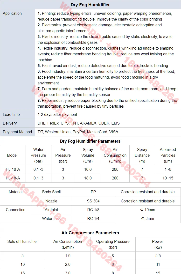 Dry Fog Humidifier Parameters | ||||||||||||