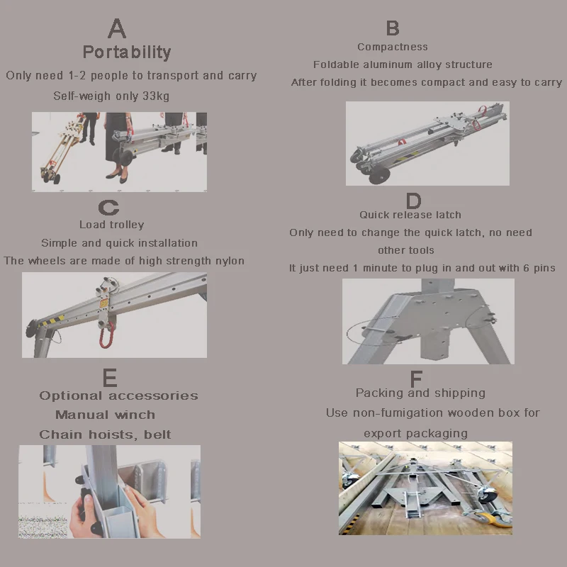 Он имеет уникальный дизайн, правильно ли установлены мелкие грузоподъемность 100-5000 кг -- супер легкий собственный вес (материал из алюминиевого сплава) очень простая установка, регулируемый диапазон, с регулировкой по высоте, и т. д. Уникальный ультра-легкий и быстро складывающийся козловые краны, что обеспечивает универсальный подъема решение для товаров и персонала