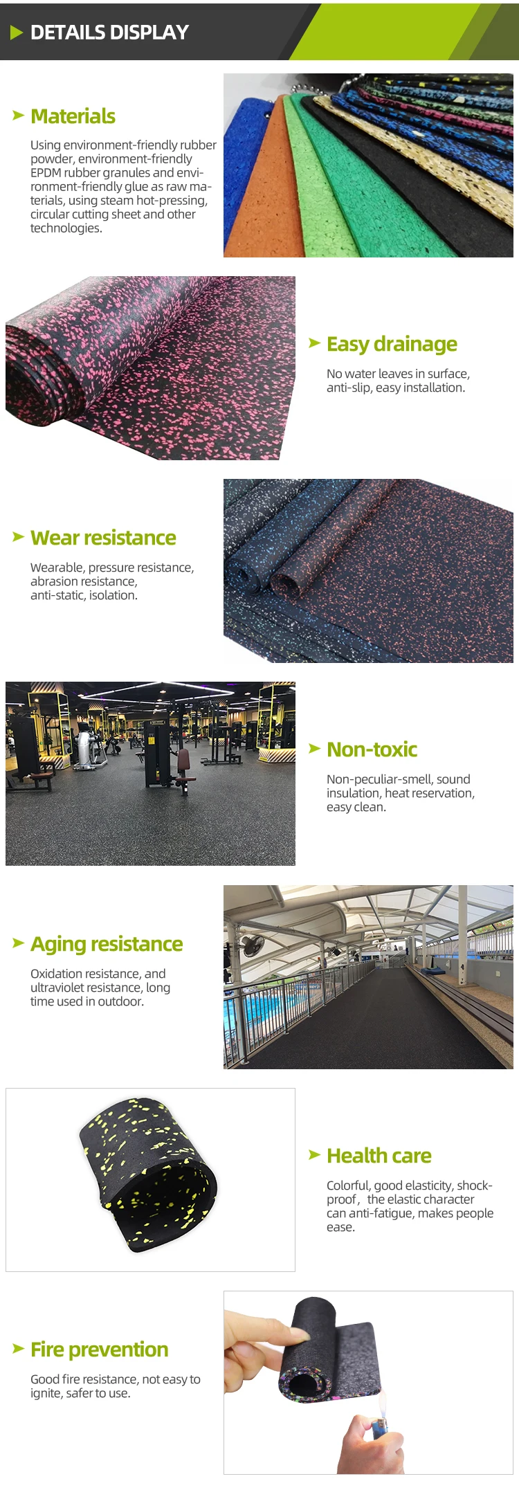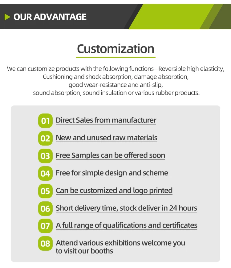Material | Using environment-friendly rubber powder, environment-friendly EPDM rubber granules and environment-friendly glue as raw materials, using steam hot-pressing, circular cutting sheet and other technologies |
