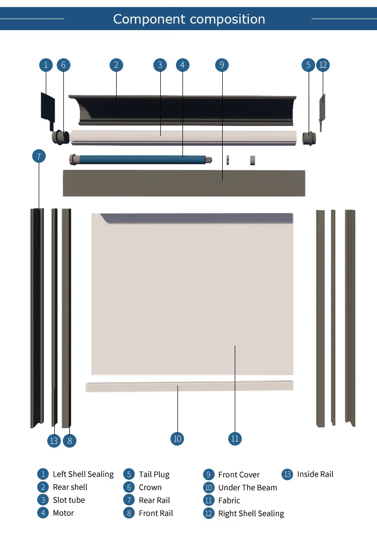 Accessory | Motorized system is including end caps for reel box, bottom caps for side rail, Tube fabric guide wheel, idle and so on. |
