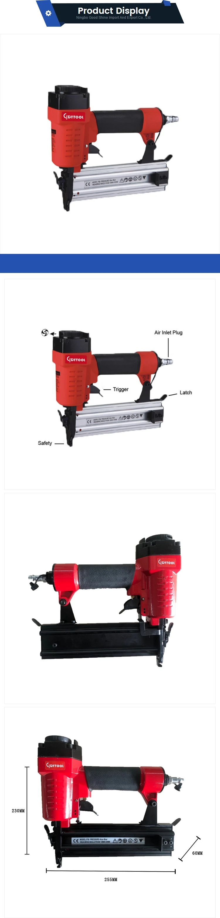 Ningbo GOOD SHINE INDUSTRY Co., Ltd. with "GDYTOOL" as its registered brand, is a manufacturer of air tools, air nailers &staplers, air spray guns, oil-less & brushless air compressors, and a variety of air accessories.With our main focus in Industrial Air Nailing and Stapling tools, High Level Brushless air compressor and Professional Grade Assembly Air Tools & air accessories business for over 10 years.We have had very stable customers in USA, Europe, South America, Middle of east, Australia and South Africa. We ensure customers of both good quality products and back-up service.We work in a very serious way at each stage of manufacturing, quality control and packaging. Our clients enjoy the business with us always.We have been developing new products at each quarter of year to follow up the air tool market and make our customers happy.