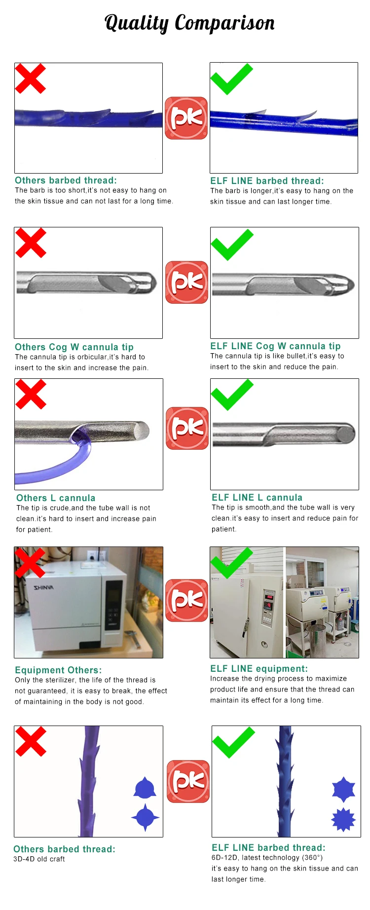 Ког с вращением на 360 градусов действует, чтобы держать кожу, как крючок, когда нить вытягивается. Он может быть применен в области лифтинга лица, подъема встык, подъема груди, подъема шеи и подъема тела. |