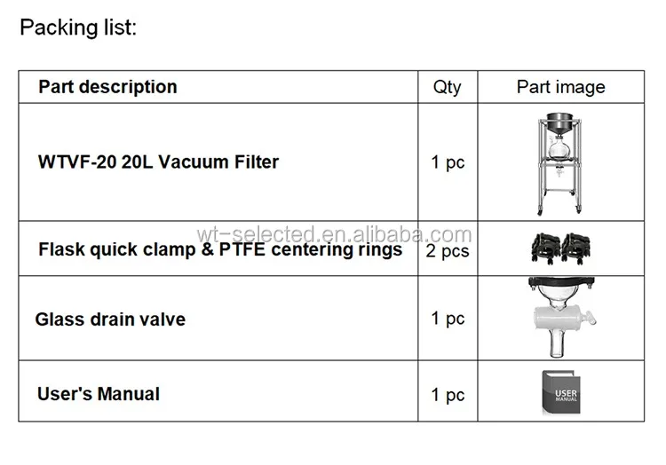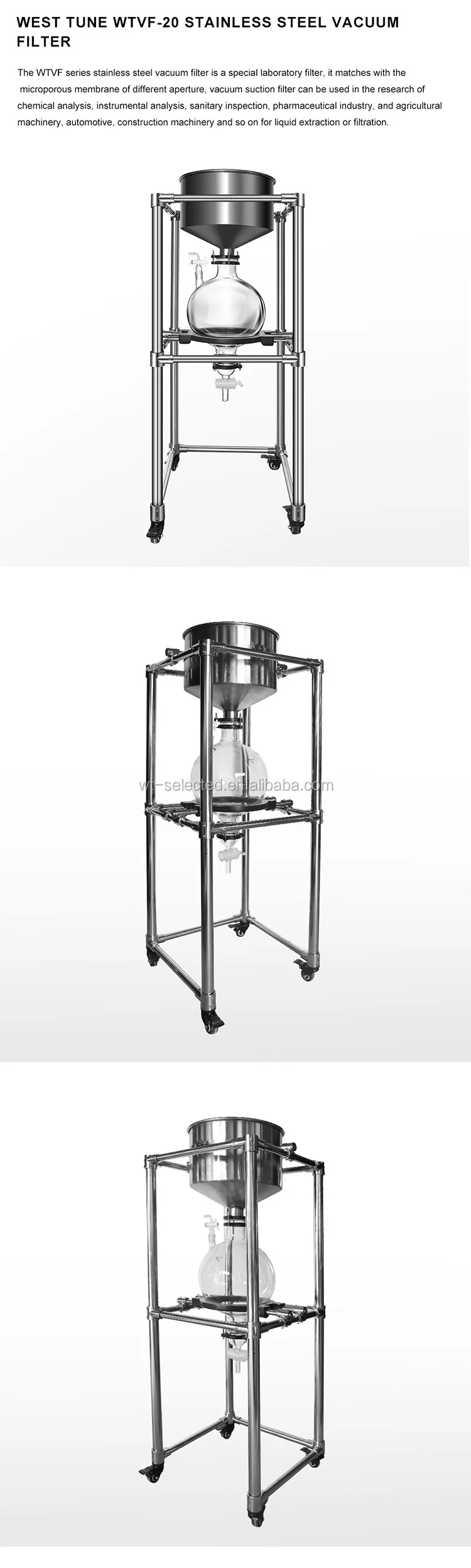The WTVF series stainless steel vacuum filter is a special laboratory filter, it matches with the microporous membrane of different aperture, vacuum suction filter can be used in the research of chemical analysis, instrumental analysis, sanitary inspection, pharmaceutical industry, and agricultural machinery, automotive, construction machinery and so on for liquid extraction or filtration.