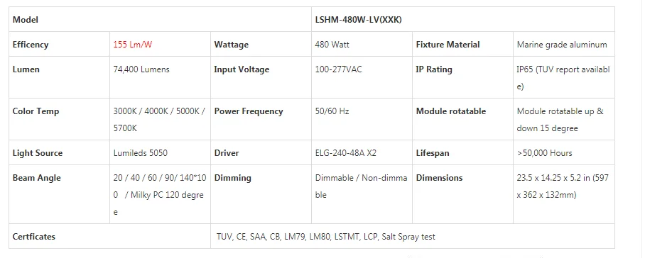 With illumination equivalent to 1000 watt metal halide fixtures you'll enjoy an "instant-on, flicker-free"cold start, and industry-leading 155Lm/W.
