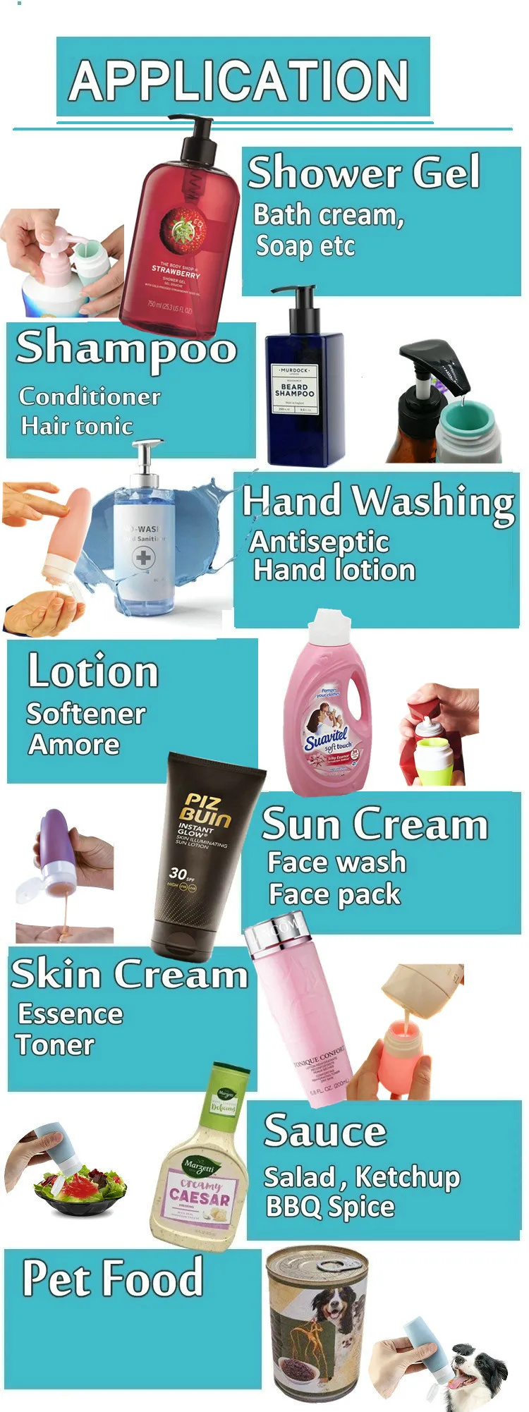 Usage: | Sub-packing and refill emulsion cosmetic as following: 1.shampoo, 2.conditioner,3.lotions,4.suntanoil, 5.liquidsoap,6.bodywash etc | ||||||