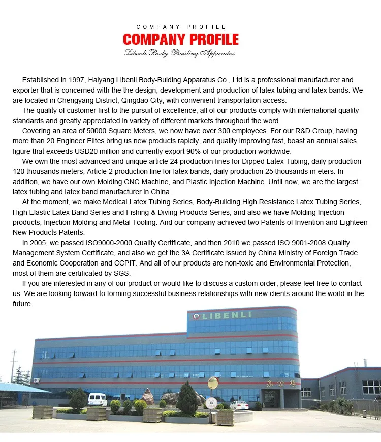 1.We are manufacturer of latex fitness products since 1997. With more than 20 years' OEM&exporter experience in the field. Specialized in fitness tube, resistance loop band, sports training items, spearfishing equipments, swim trainer and many kinds of of tubing exerciser etc.
