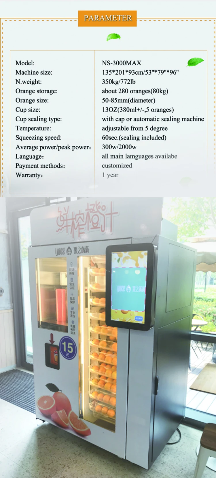 New-designed storage section can store over 80KG oranges.Combined with the whole cooling System, the oranges will keep fresh for 48 hours.