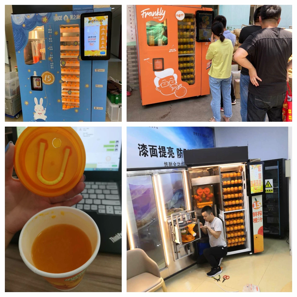 Orange juice vending machine is automatically squezing fruits, cooling the juice and seal the cup machine