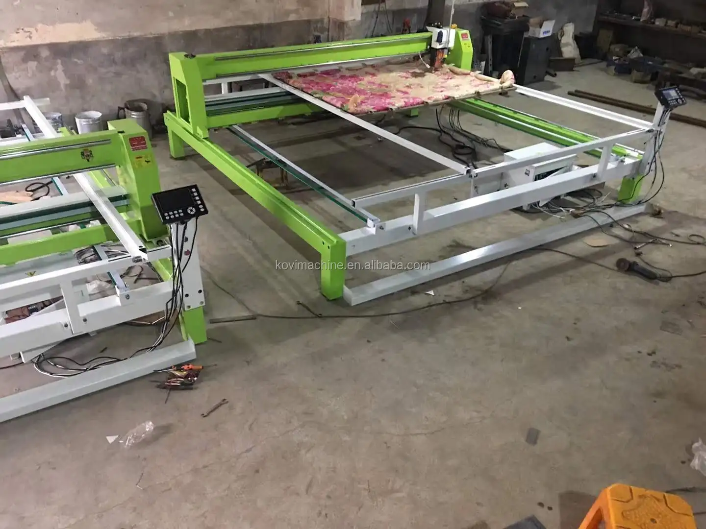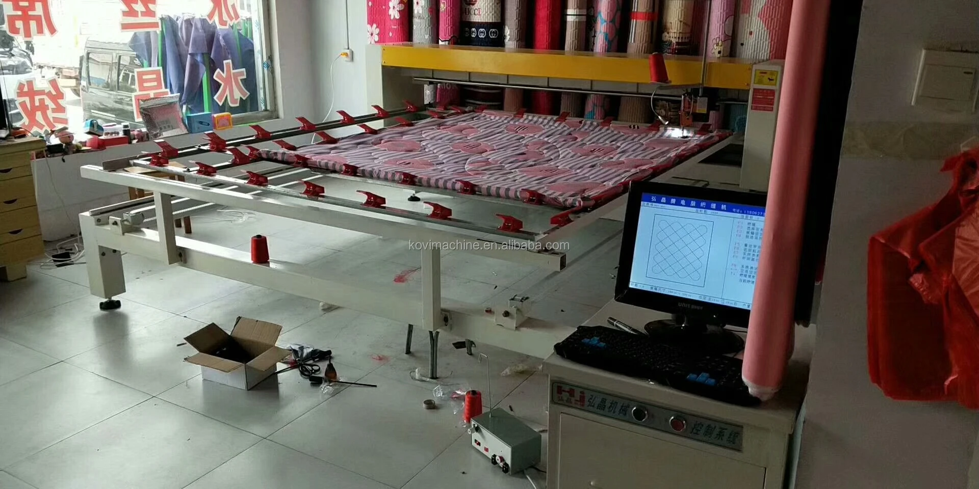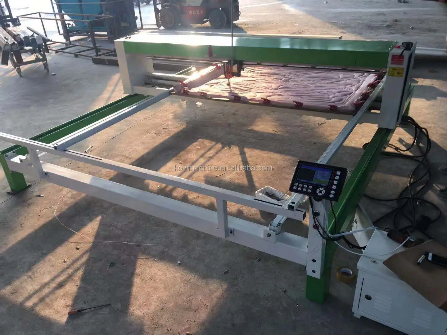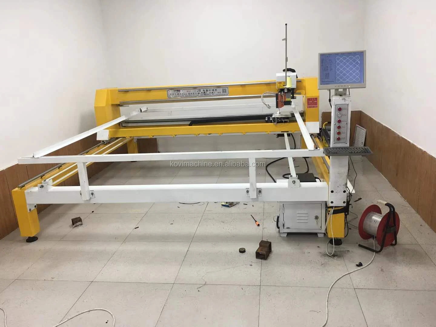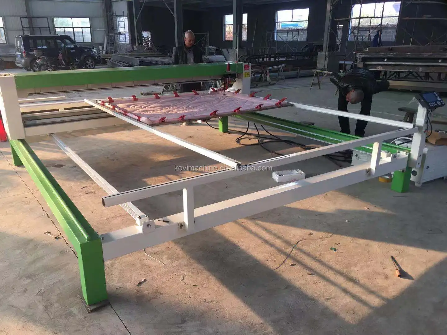 Quilting machine mainly use for quilting mattresses, bedspreads, quilts . The working prrinciple is similar to the sewing machine. (The sewing machine moves: the textile moves, the machine is stationary. The quilting machine moves: the machine moves the textile to be stationary).