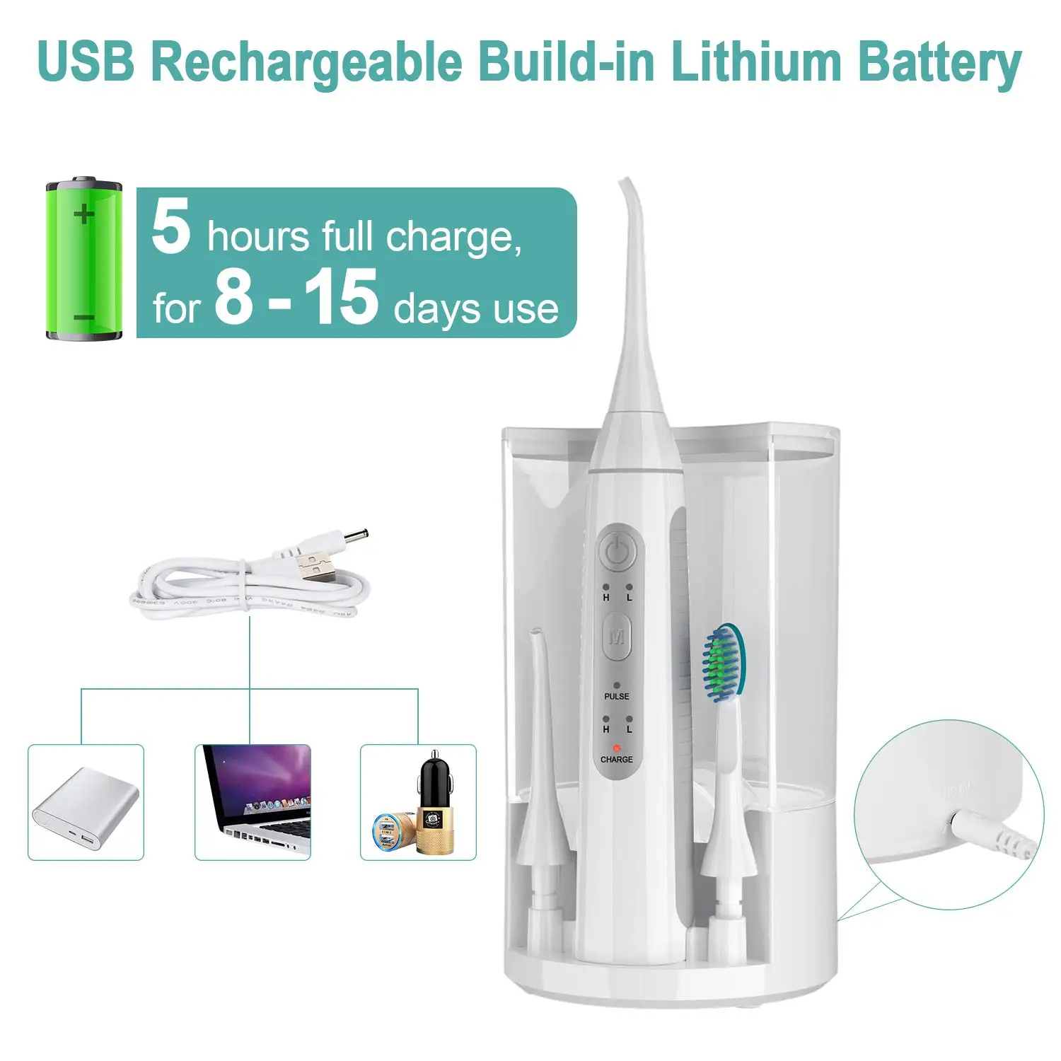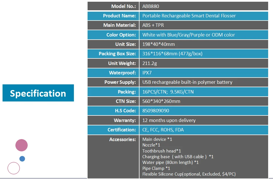 * Three types for option: 2 in 1 Portable Rechargeable Oral irrigator with Electric Toothbrush & Single function water flosser & With or without water tank