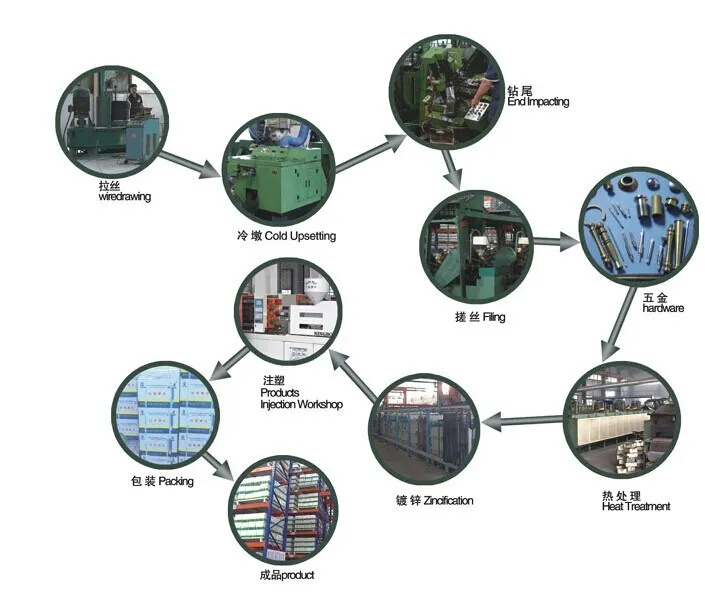 Raw Material/QC/Heading/Threading/Heat Treatment/Surface Treatment/QC Inspection/Sorting and Packing/Shipping
