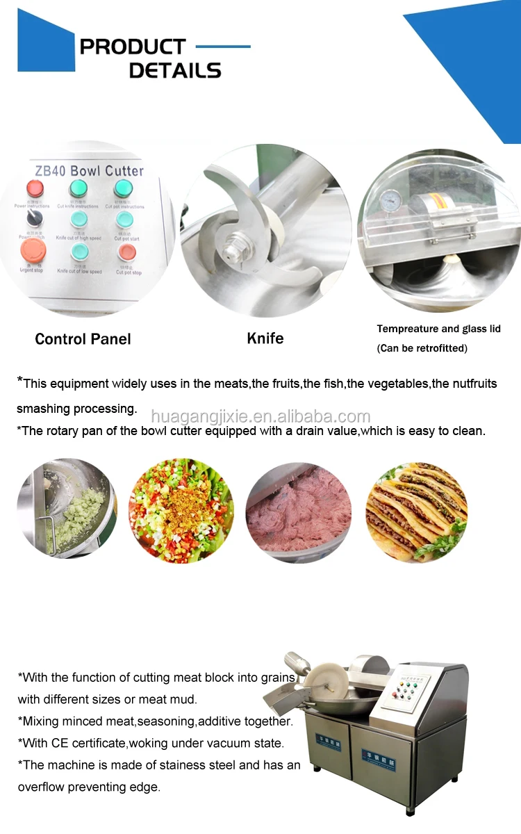 Bowl cutter use high-speed rotating chopper chop job, the main raw material meat, minced meat, finely chop cut fat meat or mess, while other raw materials such as water, bomeol, accessories, stir together run time, reduce materials heat,to maintain the natural color of fillings, flexibility, product yield and shelf lief. this machine is widely used in meat, vegetables, seafood and flavoring agents.