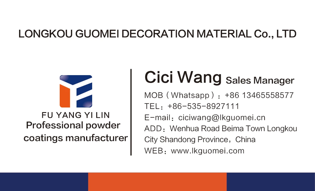 Longkou Guomei Decoration Material Co.,Ltd высокотехнологичное частный предприятие, которое специализируется на производстве терморегуляционного порошкового покрытия и фокусируется на исследованиях, разработках и маркетинге. Наша компания основана в 2006 году и после многих лет развития, наши продукты получили большую репутацию дома и за рубежом из-за стабильного качества, сильной ударопрочности, Сильной адгезии, идеальное сопротивление погодным условиям и большая площадь покраски.