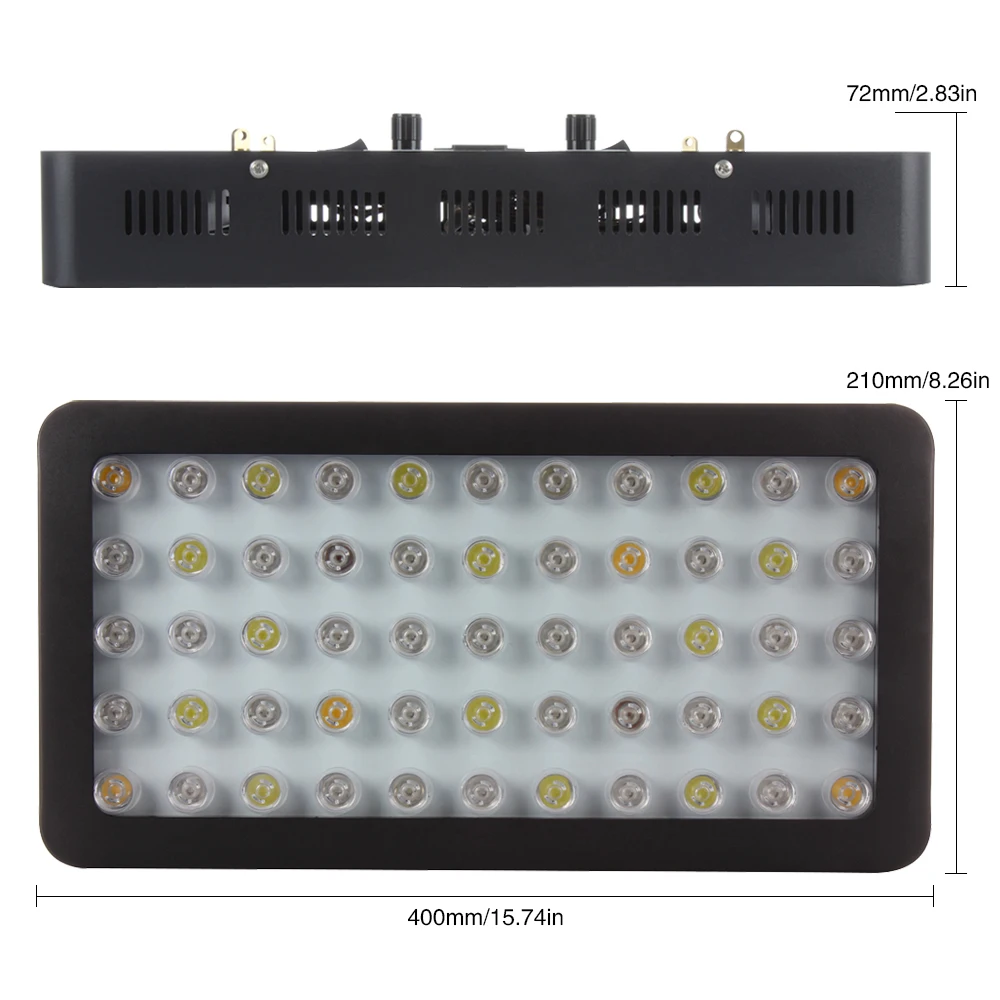 Product parameter: Power: 165W Voltage: 110V-240V Size:400*210*72mm Feature: Marine Aquarium Light / Saltwater Aquarium Light Three channels:White Channel,Blue Channel,White + Blue Channel LED OTY:55pcs 6 * Warm White 2700K 14 * Cool White 10000K 4* red 630nm 2 * Deep Red 660nm 2 * Green 530nm 27 * Blue 460nm |