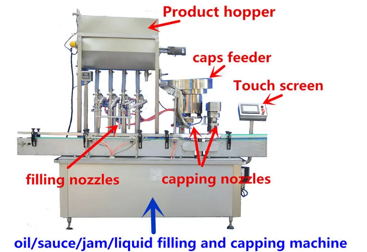 Machine is suitable for filling and capping semi-liquid products without or with small particles: such as sweet chili sauce, beef paste, bean sauce, mushroom sauce, tomato sauce, peanut butter, jam, honey, sauce, shrimp paste, shampoo, body wash, liquid detergent, dishwashing liquid, etc