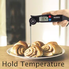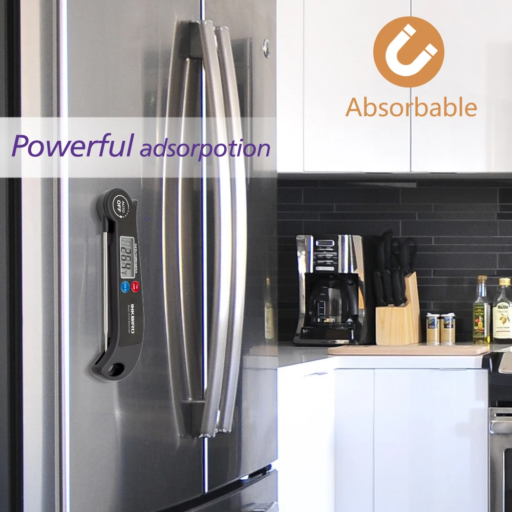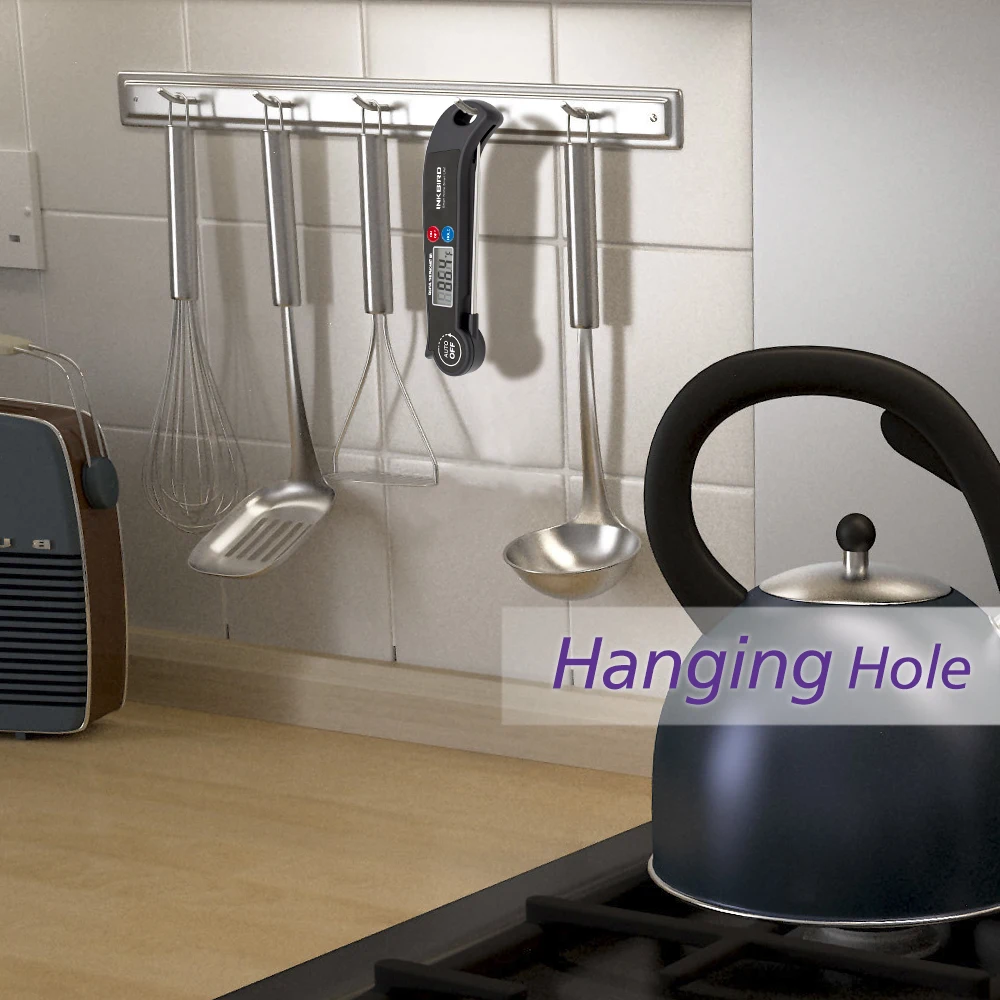Hanging Hole Design The hole on the handle position could let the device be well placed in your kitchen or other place. | Magnet Design Magnetic design on the back of the device could be adsorbed on steel material strongly. | Fast Readout & High Accuracy Fast Readout within 4 - 7 seconds ±1.8° temperature reading accuracy from -4 to 392°F With step-down probe design. | Hold Temperature Function Hold on the temperature reading before withdrawing the probe from the food. |