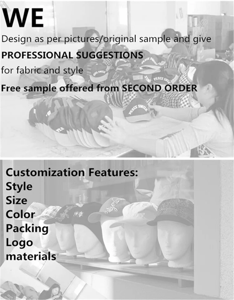 | BASIC INFO: STYLE: baseball cap/ snapback cap/ dad/ trucker cap/ dad hat/ fishing cap/ sun visor cap PANEL STYLE:5/6 panels CIRCUMFERENCE:56-62cm BACK CLOSURE: plastic buckle, metal buckle, strap buckle, leather buckle etc BRIM(VISOR):sandwich brim, flat brim or curve brim EYEMATERIAL: cotton, polyester, corduroy, wool, suede etc COLOR: could be custom as the request LOGO: custom the printed logo,3D embroidery or flat embroidery logo, patch embroidery ... GENDER: unisex, men, women | |