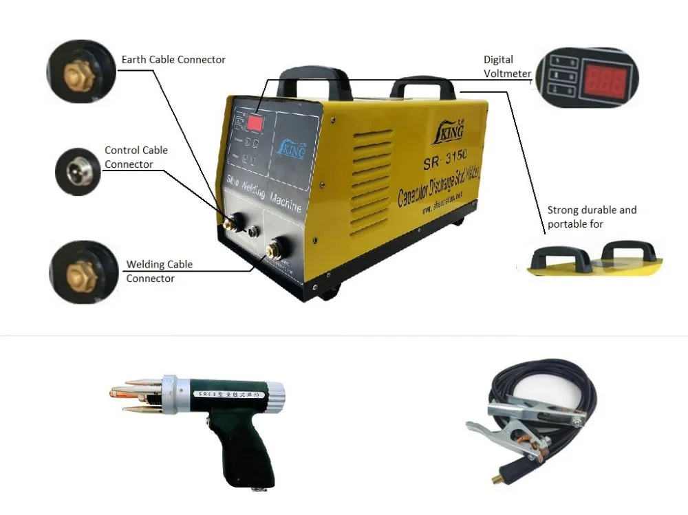 Each Set included accessories | (1). 1pc welding gun SRQ3 or SRQ5; (2). 3m ground wire with 1pc ground clamp; (3). 5m welding cables; (4). 4 sets stud chucks; (5). Hook spanner; (6). Documents. |