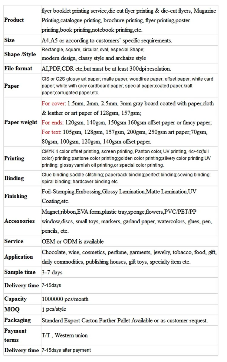 - Please provide your products' quantity, size, pages of cover and text, colors on both sides of sheets(eg,full color both sides), paper type and paper weight ( eg. 128gsm glossy art paper), surface finish ( eg. glossy / matt lamination, UV), binding way ( eg. perfect binding, hardcover).