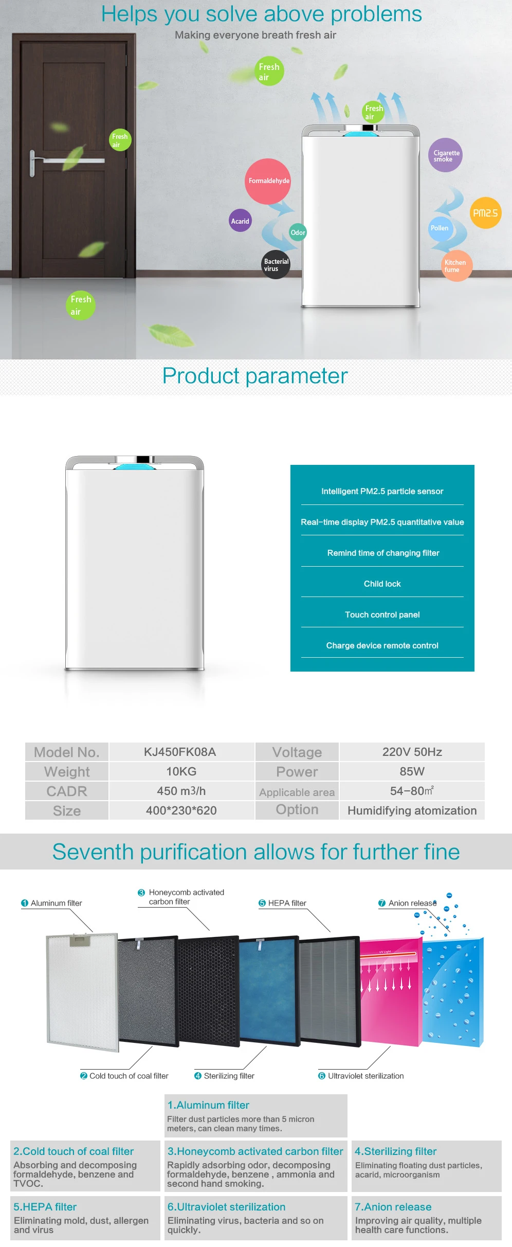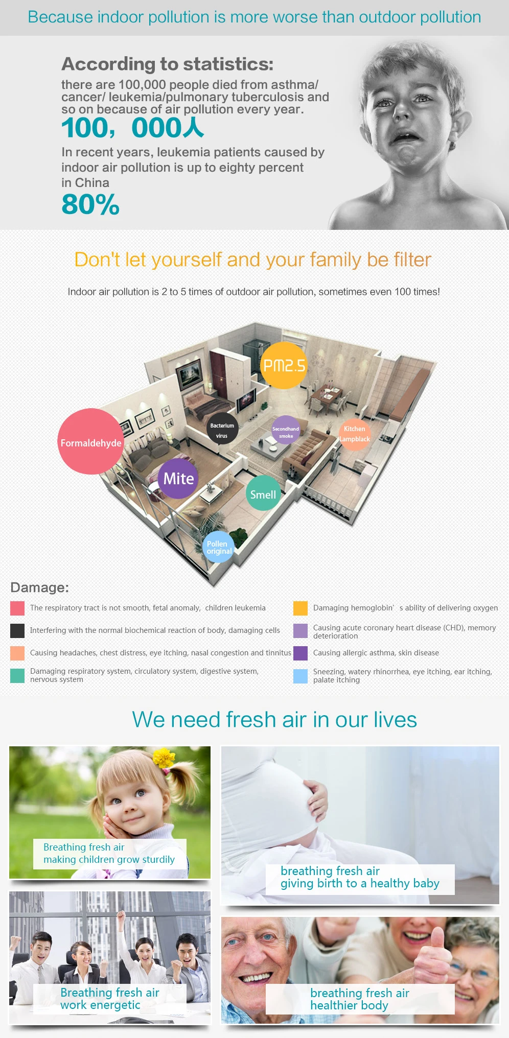 2.Eliminate dust, pollen, allergy, nold and Kill bacterial, virus, germs.