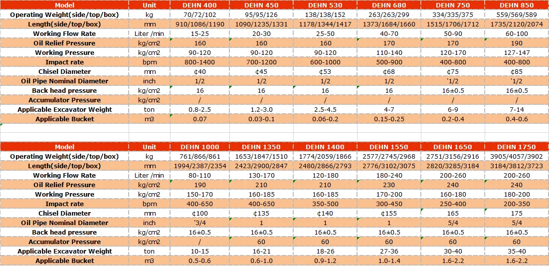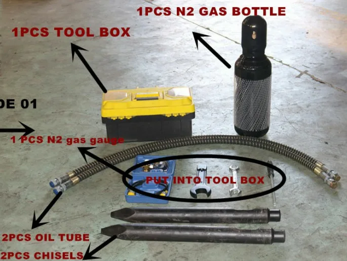 2.The standard free spare parts: 2 pcs of Chisel , 2 pcs of oil tube , 1 pc of Nitrogen Cylinder , 1 set of repair tools with tool box , a nitrogen pressure gauge .