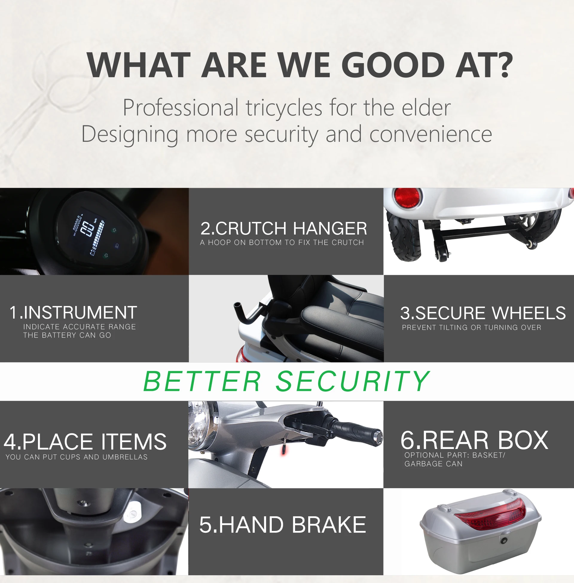 Brake: F/ R: | Disc/ Drum | Max. speed | 15/20/25Km/h | |||