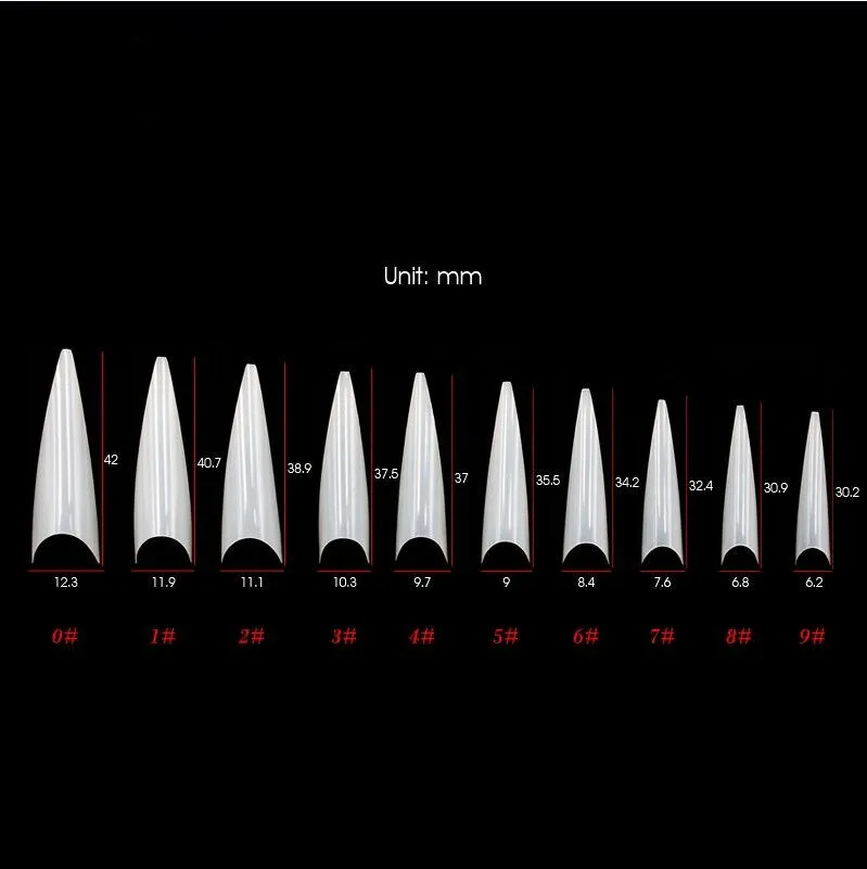 Sizes: 0#--9# ,10 different size (50 pcs of each size,and totally 500pcs packaging in a bag). 500pcs False / Acrylic / Artificial Nail Art Tips .