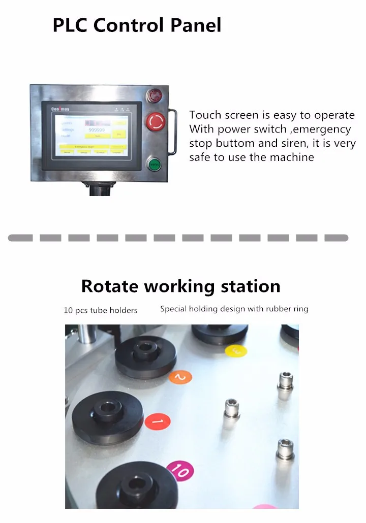 2.The machine has 10 sits. Expect manually putting the tubes on the machine, it can automatically fill the material into the tubes, heat both inside and outside of the tubes, seal the tubes, press the codes, and cut the tails and exit the finished tubes.