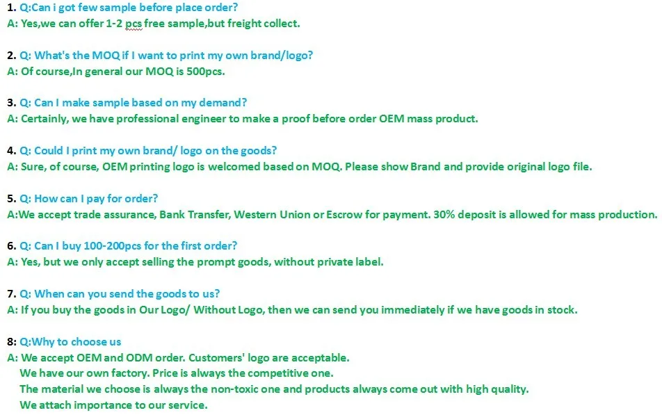 Shipment | Samples by your courier No. (Such as DHL, Fedex, EMS and so on) The goods of order by air, sea (As your request) | ||||