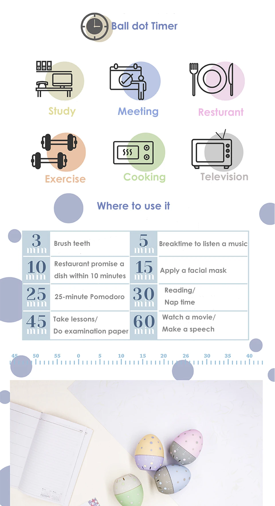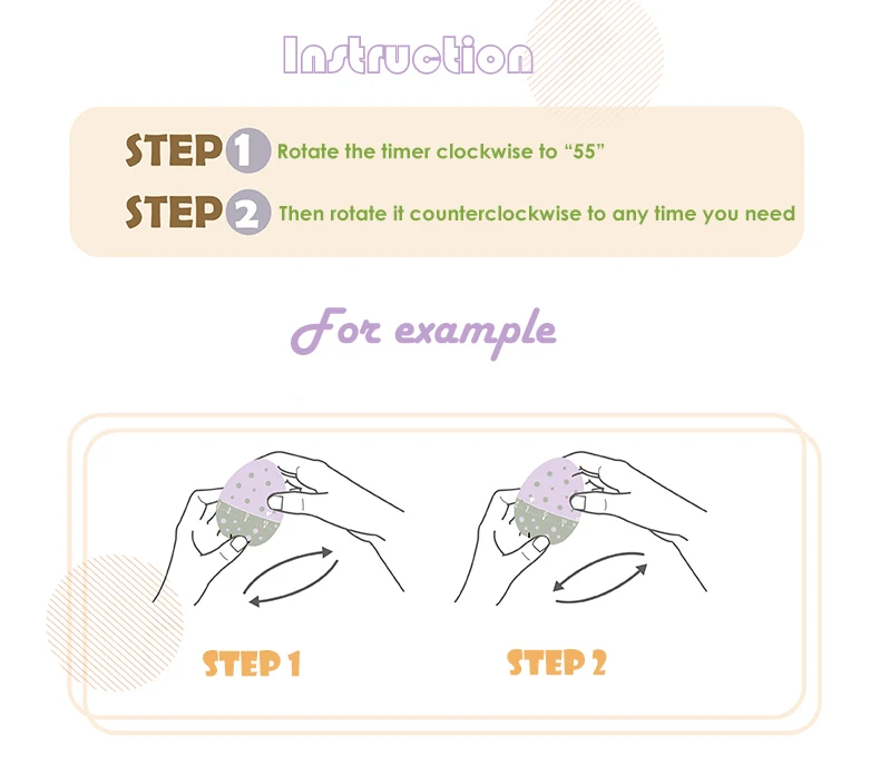 How to use | Use mechanical transmission and ring, without batteries, turn the timer clockwise to 55 scale, then counterclockwise back to the required time, the timer will emit a crisp bell |