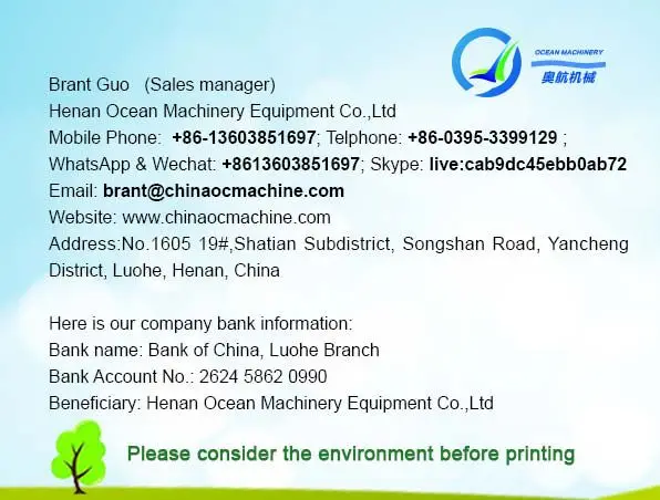 Henan Ocean Machinery Equipment Co.,Ltd., сертифицированное ISO9001 и высокотехнологичное предприятие, созданное более 10 лет назад, является профессиональным производителем, специализирующимся на НИОКР, производстве и продаже механических продуктов оборудования, таких как машина для переработки пищевых продуктов, машина для фруктов и овощей, машина для пищевых продуктов и упаковки, буровая установка для бурения скважин на воду и эквиваленты птицы и т. д. Которые широко продаются по всему миру, и мы были признаны нашими клиентами из года в год.