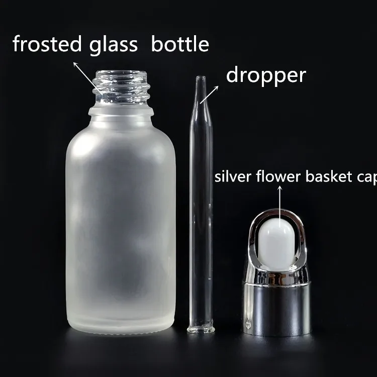 Frosted glass dropper bottle with dropper and gold silver flower basket cap