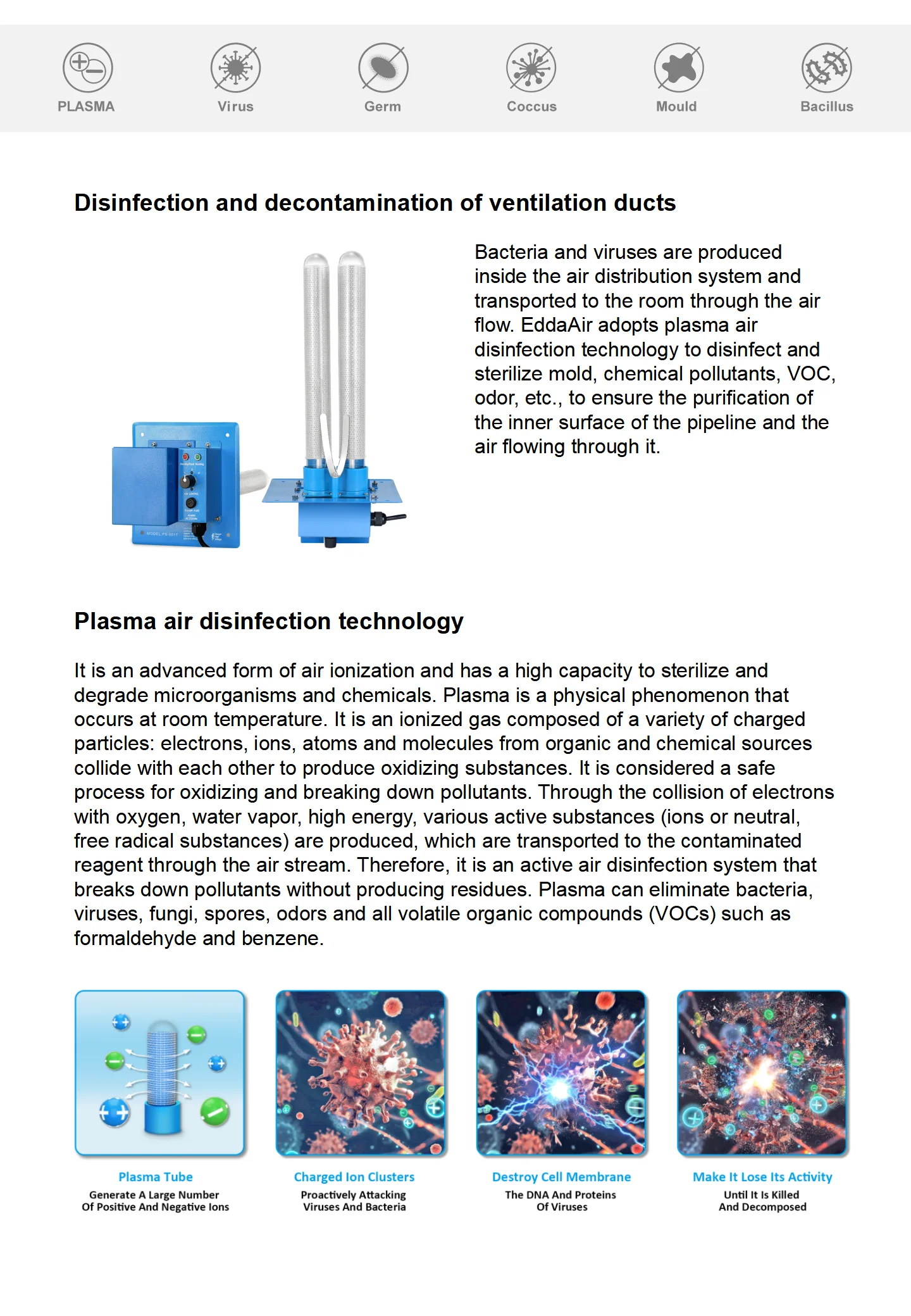 Plasma air treatment technology can be a very effective solution to the daily sterilization and disinfection problems of large space processing workshops. It has the ability of broad-spectrum sterilization, high elimination efficiency, and can reduce the concentration of bacteria, viruses and odors in a short period of time. Plasma technology can kill in all directions, without dead-end restrictions, and can realize the coexistence of man and machine, safe and no secondary pollution, does not affect the production, and does not require special management. The equipment is pollution-free, without consumables, with cost savings and high efficiency and environmental protection advantages.