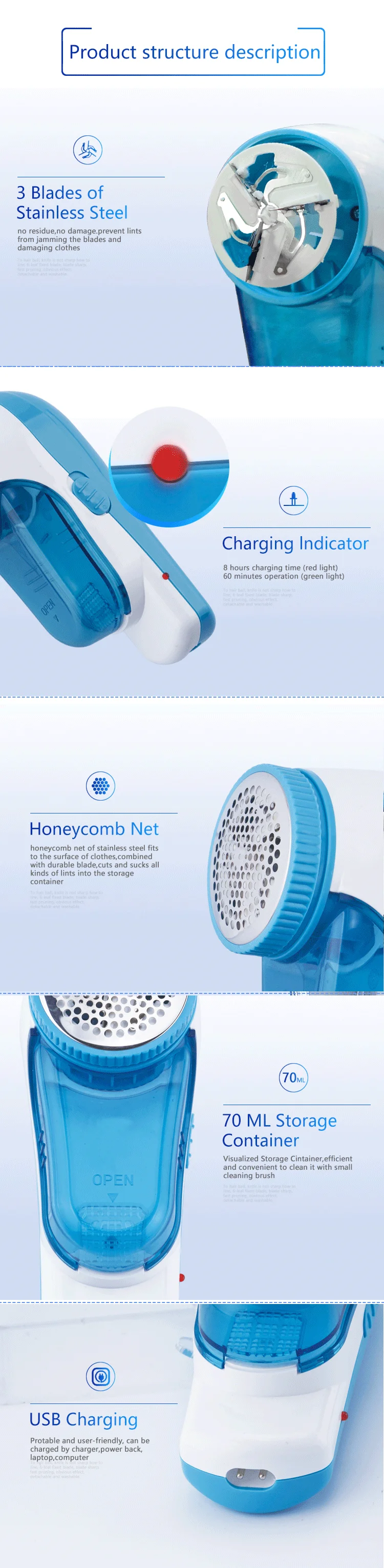 Accessories Package: Small cleaning brush + USB charging cable + PE bag + Instructional Manual + Spare blade (Optional) |