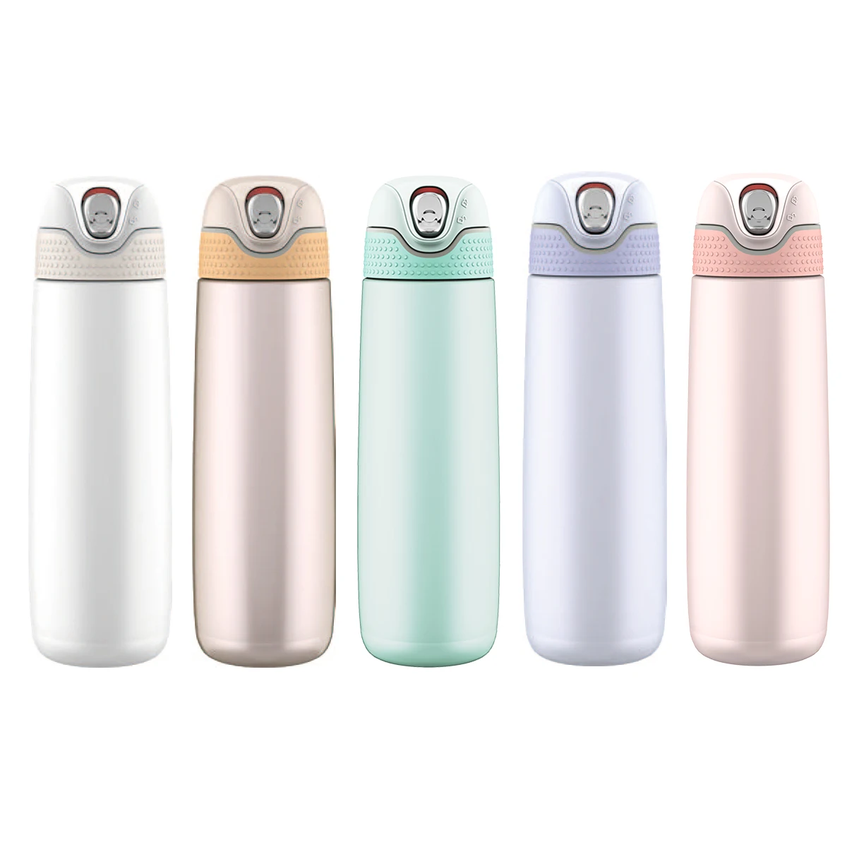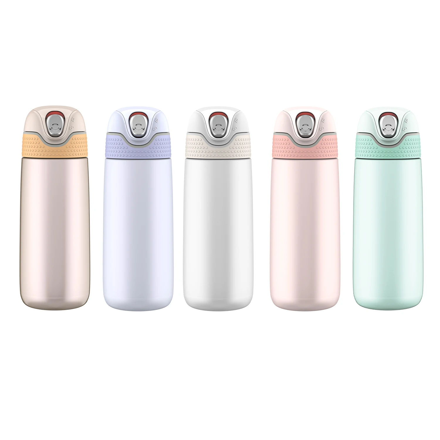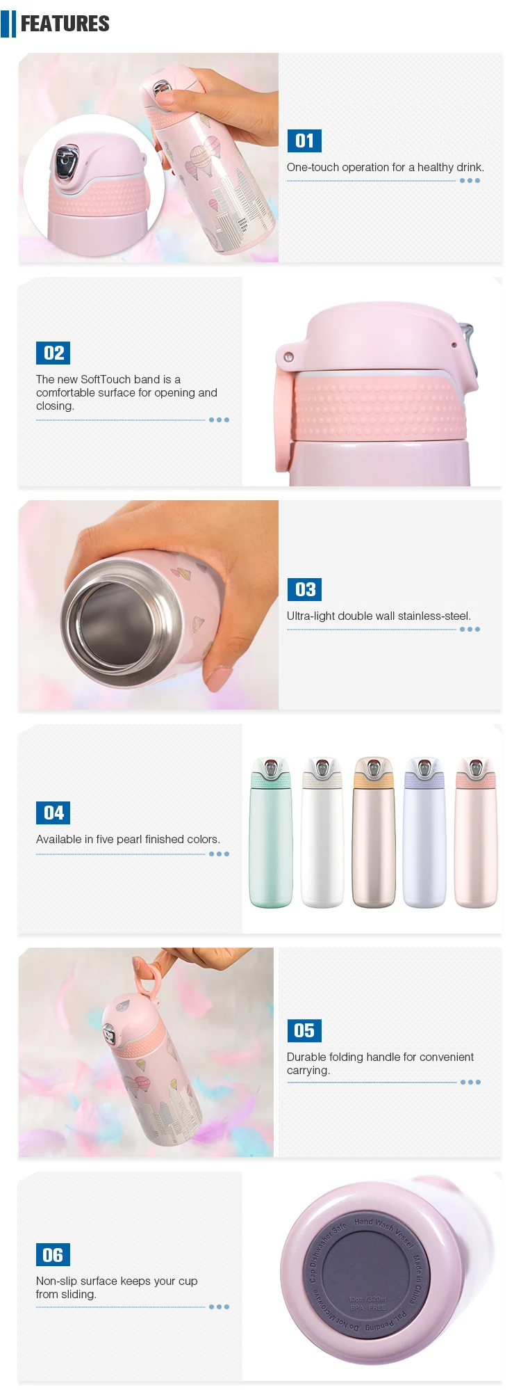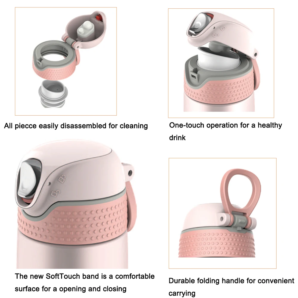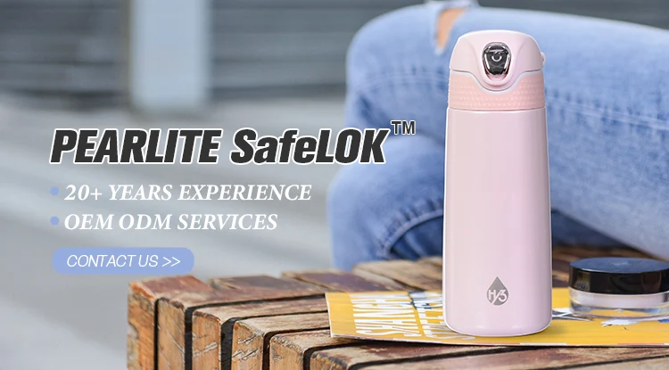 Our newest Hy3 family member is the PEARLiTE stainless-steel thermal bottle with our unique SafeLOKTM System lid. Push the button up for a secure lock. The spring-assisted lid unlocks with a downward click and opens with one finger, revealing a large drinking area with two silicone seals. Grip the soft-touch finish and remove the top, and the drinking nozzle can be completely disassembled for thorough cleaning. An integrated rear handle is foldable and convenient. The bottle itself is ultra-light and double wall stainless-steel to maintain hot or cold temperatures. Choose from five new colors and two sizes.The 320ml bottle is just right for a purse or small bag. The 420ml bottle is great for your backpack or hand and will hydrate your long journey. Both sizes feature our new SafeLOKTM System lid.