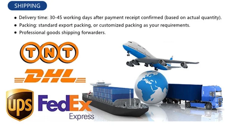 A5: для малого заказа, экспресс-доставка будет лучше. И для оптового заказа, морской способ доставки лучше всего, но займет много времени Для срочных заказов, мы предлагаем по воздуху в аэропорт плюс наш партнер корабля отправить к вашей двери
