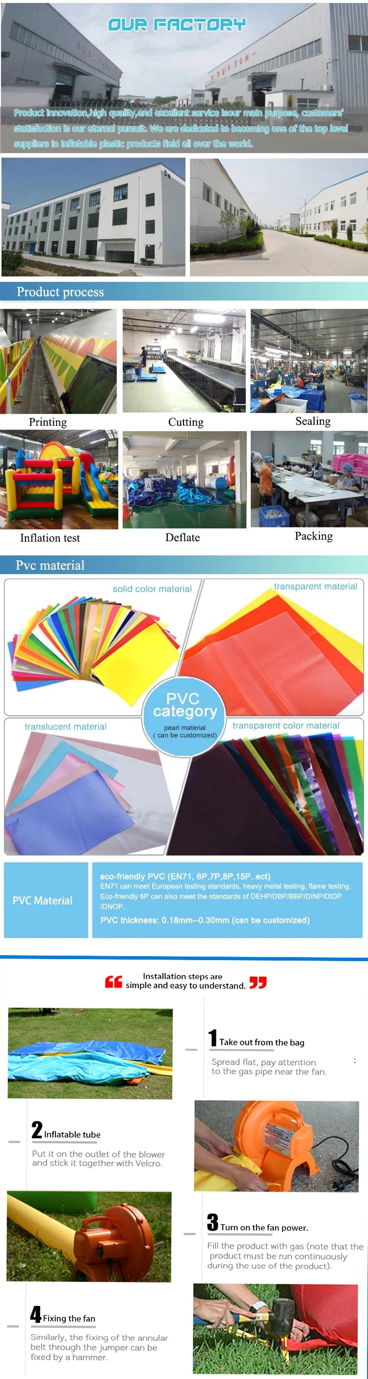 unfold the inflatables, then connect the air blower with inflatable and turn on the electricity to inflate it.