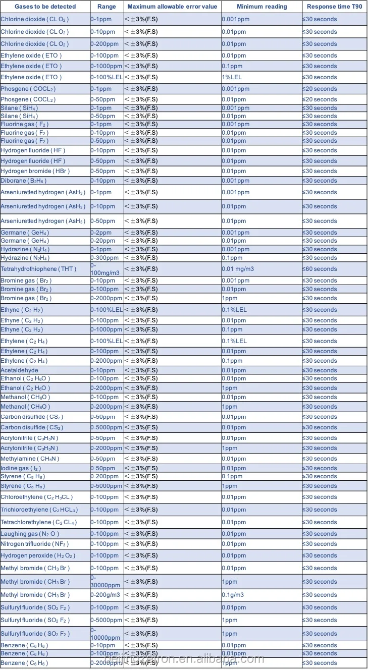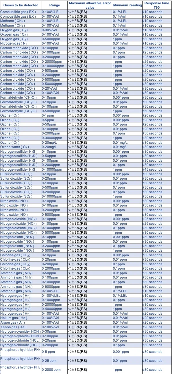 Detection range | 0 ~ 1, 10, 100, 1000, 5000, 50000, 100000ppm, 200 mg/L, 100%LEL, 20%, 50%, 100%Vol, can be selected; and other ranges can be customized. | ||||||||